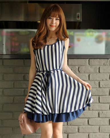 Những cô nàng tiểu thư “bánh bèo” sẽ trở nên trẻ trung hơn, khỏe khoắn hơn với item này.Tuy đơn giản nhưng vẫn toát lên vẻ đẹp dịu dàng, thanh lịch và bắt mắt. Những cô nàng diện đầm kẻ sọc dáng xèo sẽ dễ dàng trở thành tâm điểm của mọi sự chú ý.