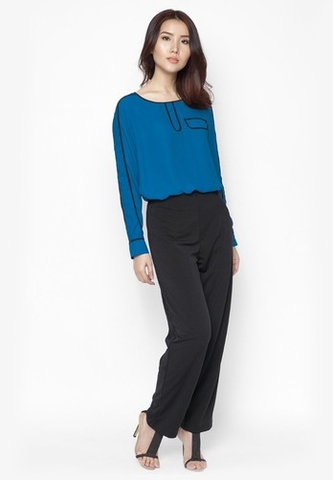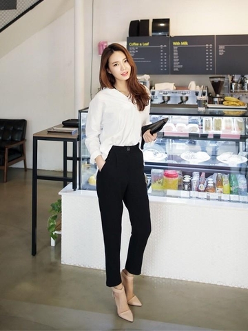Áo sơ mi trắng cách điệu kết hợp cùng quần tây form rộng xanh dương cũng là một trong những cách phối màu quần áo nữ công sở rất được các cô nàng ưa chuộng.Màu sắc nhẹ nhàng tạo nên nét nữ tính, thanh lịch cho bộ trang phục công sở.