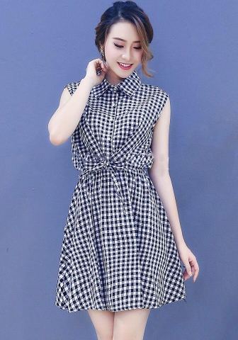 Đầm xòe caro đen trắng cổ sơ mi