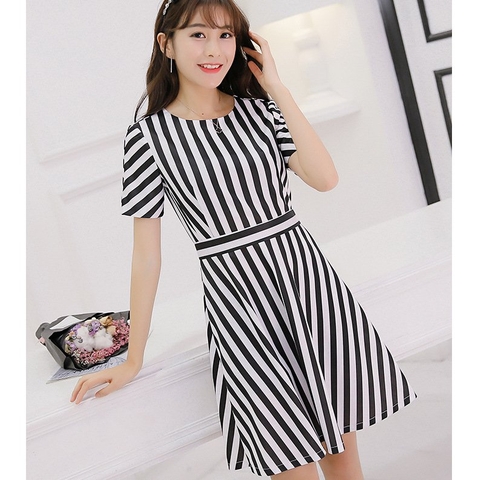 Những đường kẻ sọc nhiều màu sắc luôn mang đến sự tươi mới, trẻ trung, cá tính. Điều này không chỉ giúp váy đầm công sở dáng xòe họa tiết nổi bật bởi những đường kẻ tưởng chừng đơn điệu mà còn còn là “bí kíp” để các nàng che đi nhược điểm trên cơ thể.